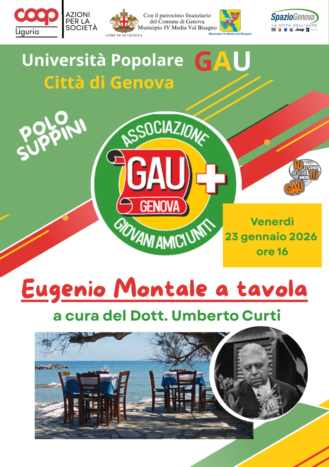 Presso la GAU (Giovani Amici Uniti) in piazza Suppini, a Genova Struppa, su invito della gentile Signora Marisa Burlando ho tenuto la conferenza “Montale (e la Gina * ) a tavola. Frammenti di vita e curiosità gastronomiche tutt’attorno al poeta genovese Premio Nobel”.