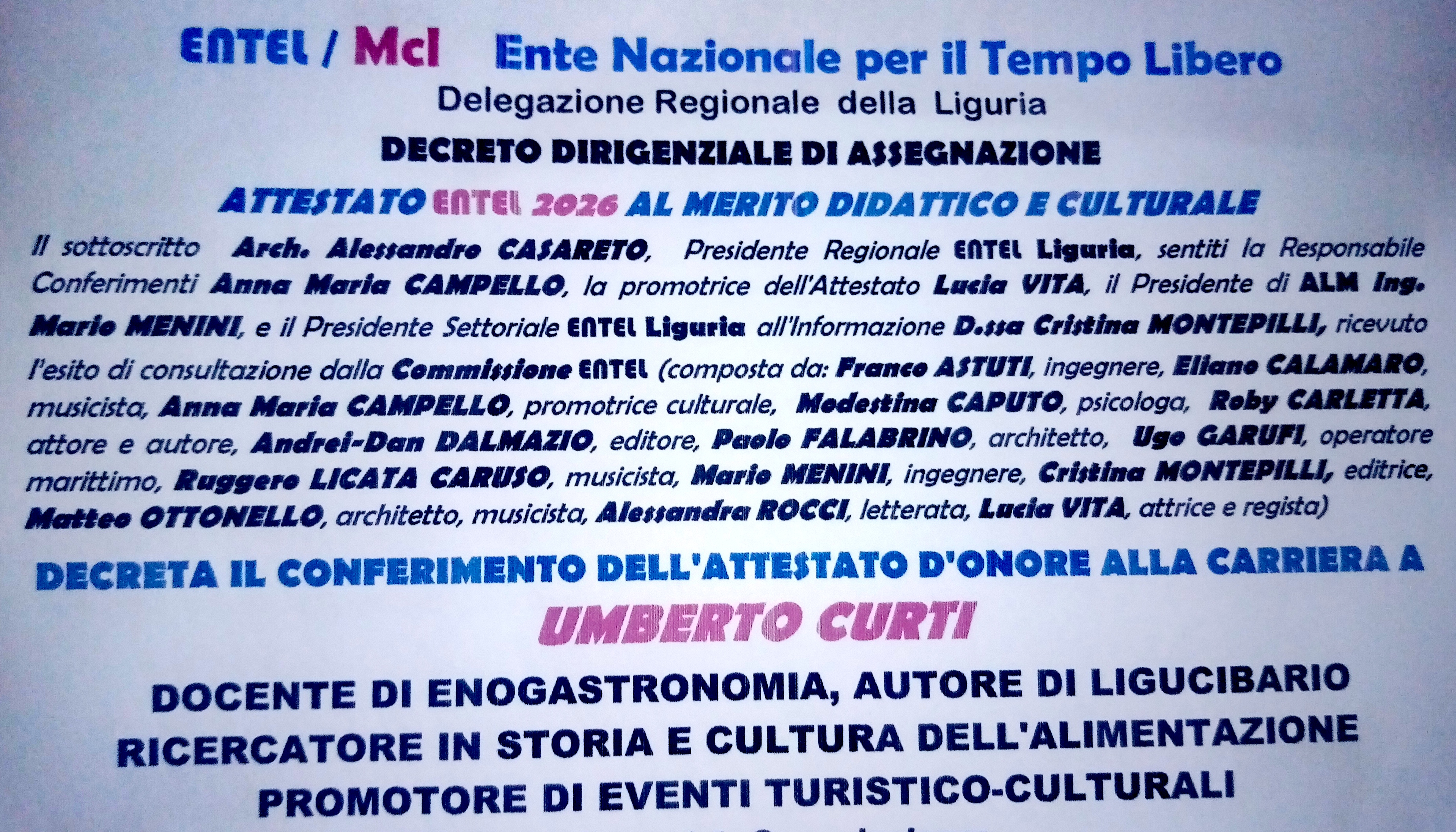 Martedì 28 aprile, presso il Salone di rappresentanza di Palazzo Doria Tursi (Comune di Genova), nell’àmbito dell’articolata iniziativa “Genova e la Liguria alla ricerca delle origini” patrocinata dal Comune, mi è stato conferito l’Attestato d’onore ENTEL al merito didattico e culturale.